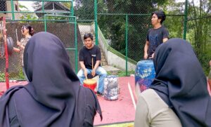 Sejumlah anggota UKM KREMMASI sedang memainkan alat musik dari barang-barang yang sudah tidak terpakai, dalam kegiatan latihan Kresipah guna menyambut KMP IISIP Jakarta. Foto: Muhamad Farhan