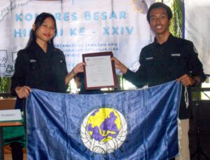 Potret Fauzan (kanan) terima serah jabatan dari eks Ketua Umum HIMAHI periode 2024/2025 Khairunnisa (kiri) di kegiatan kongres besar HIMAHI yang ke-24. Foto: HIMAHI IISIP Jakarta