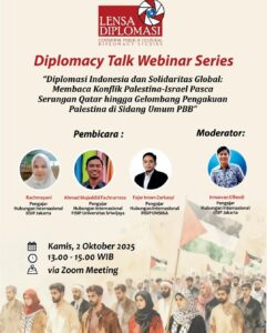 Diplomacy Talk Webinar Series akan segera terlaksana pada Kamis, 02 Oktober 2025, yang dimulai pada pukul 13.00 hingga 15.00 WIB. Kegiatan ini nantinya akan dilakukan melalui Zoom Meeting dan dibuka secara umum, sehingga para peserta yang ingin terlibat dalam diskusi, dapat merasakan dari jarak jauh.