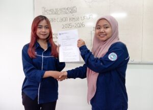 Potret Ani Ratna Sari (kanan) Ketua Umum HIMAJUR IISIP Jakarta periode 2025/2026, menerima penyerahan lembaran AD/ART yang diberikan Khalisa Putri Septiani (kiri) sebagai eks Ketua Umum periode 2024/2025 di ruang 2B.2 IISIP Jakarta, Jumat (10/10/2025). Foto: Muhamad Farhan