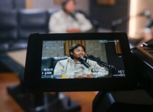 Potret salah satu mahasiswa IISIP Jakarta pada saat melakukan produksi podcast di laboratorium podcast IISIP Jakarta. Foto: Muhamad Farhan