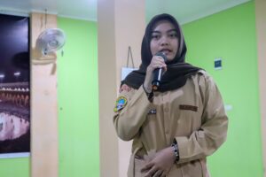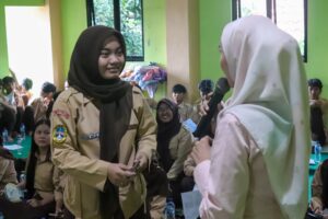 Nazwa Aulia, siswi kelas 12 SMK PGRI 23 Jakarta diberikan kesempatan untuk melakukan sesi tanya jawab kepada tim kegiatan PKM. Foto: Muhamad Farhan