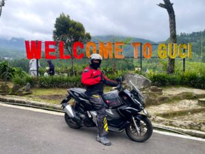 Potret salah satu anggota LA 32 Riders, yang tengah melakukan touring tiba di Guci. Foto: LA 32 Riders
