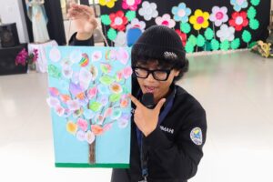 Potret anggota HIMAHI IISIP Jakarta, tunjukan pohon kertas hasil karya anak-anak Panti Asuhan Pondok Boncel pada saat kegiatan berlangsung, Selasa (13/1/2026). Foto: Muhamad Farhan