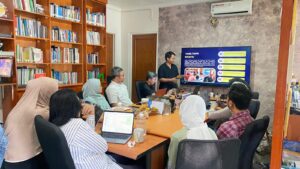 Potret alumni Program Magang Industri Ilmu Kesejahteraan Sosial IISIP Jakarta Rayya Ramadhan, ketika melakukan presentasi dari hasil laporan magang di ECPAT Indonesia. Foto: Rayya Ramadhan