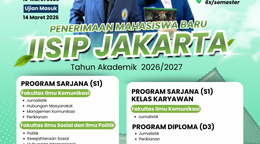 IISIP Jakarta buka Pendaftaran  Mahasiswa Baru (PMB) Tahun Akademik 2026/2027, bagi calon mahasiswa jika tertarik segera daftarkan sebelum di tutup. Foto: Muhamad Farhan JAKARTA, IISIP– Institut Ilmu Sosial dan Ilmu Politik Jakarta (IISIP Jakarta) masih membuka Penerimaan Mahasiswa Baru (PMB) gelombang pertama Tahun Akademik 2026/2027. Pendaftaran ini terbuka bagi calon mahasiswa yang ingin melanjutkan pendidikan di berbagai jenjang, mulai dari program Sarjana, Magister, hingga Diploma. Baca Juga: “Penerimaan Mahasiswa Baru...