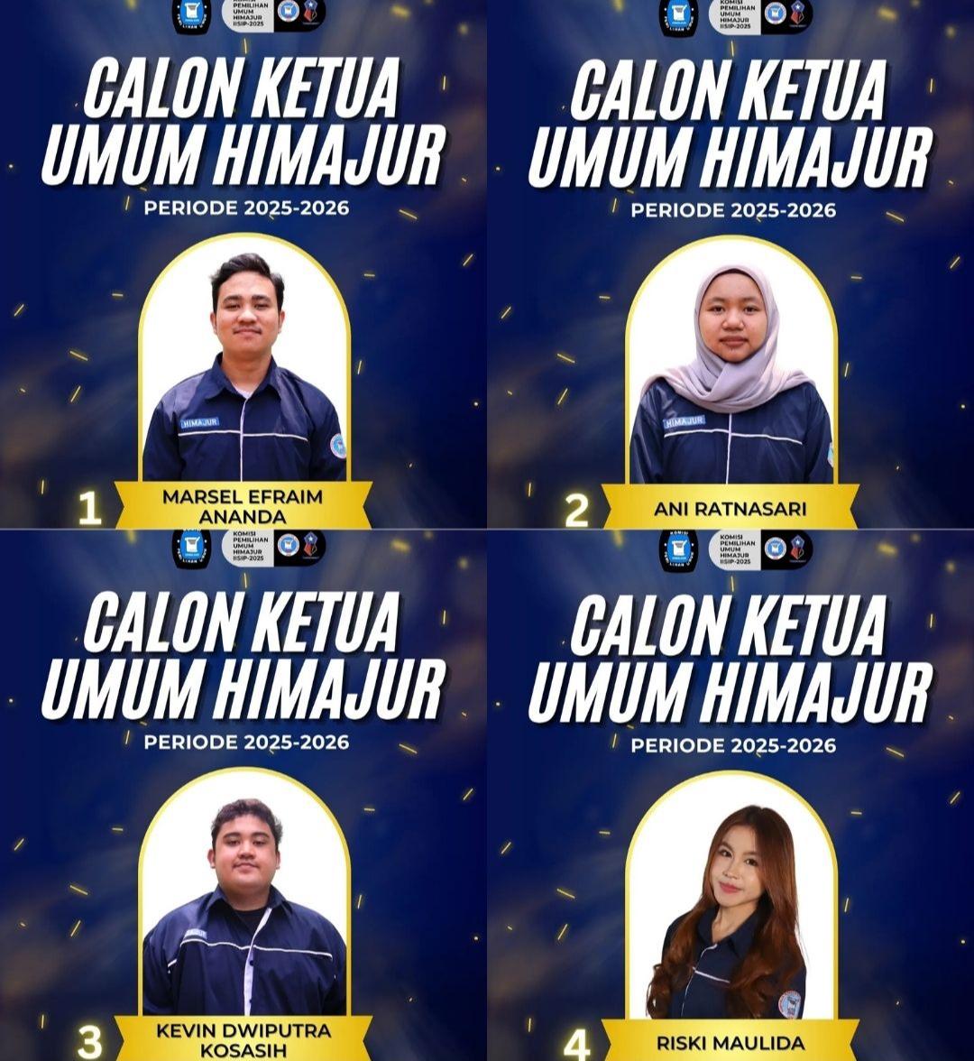 Inilah daftar calon Ketua Umum HIMAJUR periode 2025/2026, yang akan mengikuti prosesi debat pada Kamis, 9 Oktober 2025. Foto: HIMAJUR IISIP Jakarta/Muhamad Farhan JAKARTA, IISIP – Jelang pelaksanaan pemilihan calon Ketua Umum Himpunan Mahasiswa Jurnalistik (HIMAJUR) Institut Ilmu Sosial dan Ilmu Politik Jakarta (IISIP Jakarta), tim Komisi Pemilihan Umum (KPU) HIMAJUR umumkan empat calon kandidat...Read More